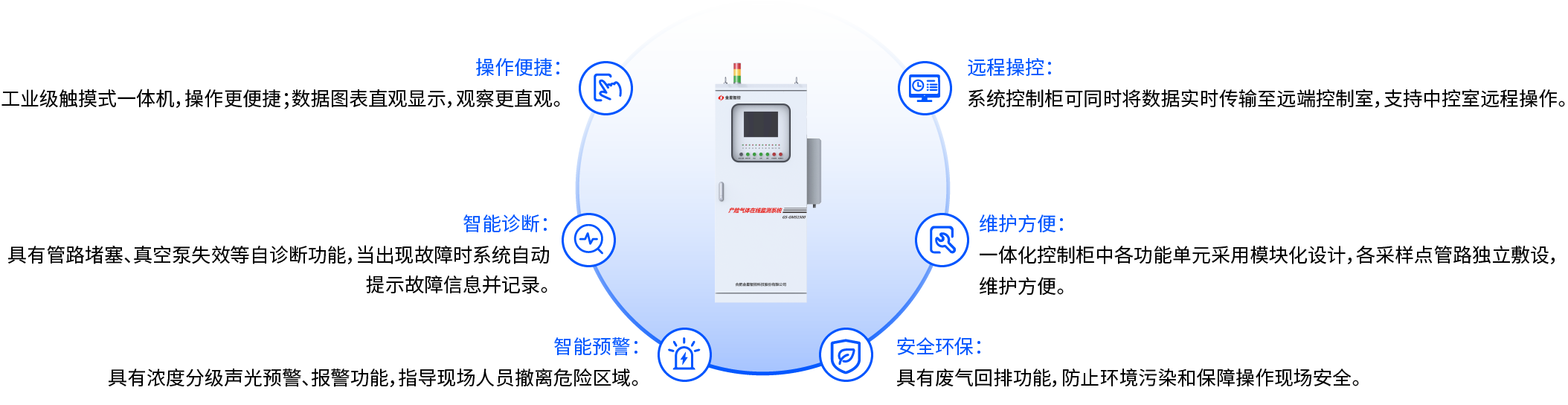 GS-GMS1500 危險(xiǎn)氣體在線監(jiān)測系統(tǒng)是一款針對有毒有害、易燃易爆等危險(xiǎn)氣體多區(qū)監(jiān)測的系統(tǒng),采用連續(xù)抽取方式,通過真空泵把危險(xiǎn)區(qū)域氣體引入到安全區(qū)域一體化控制機(jī)柜,結(jié)合電化學(xué)、催化燃燒、熱導(dǎo)等測量原理,對取樣氣體中CH4、H2S、CO、NH3、O2等氣體濃度進(jìn)行輪流監(jiān)測,具備自診斷、報(bào)警等功能,實(shí)現(xiàn)超標(biāo)就地報(bào)警并將相關(guān)信息傳送到控制室。